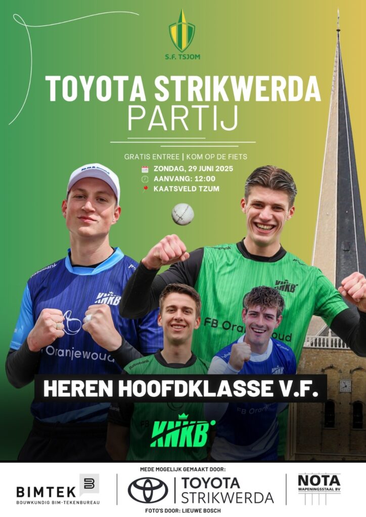 Zondag 29 juni vanaf 12:00 uur is het zover: de beste heren uit de kaatswereld strijden in Tsjom. Kom ook langs om “onze” Tsjommer hoofdklasser aan te moedigen en geniet van spannende wedstrijden!